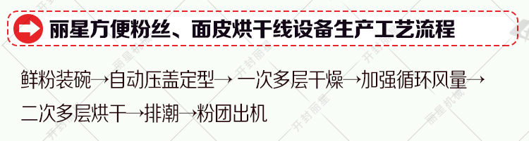 工藝流程:鮮粉裝碗→自動壓碗定型→?次多層干燥→加強(qiáng)循環(huán)?量→二次多層烘干→排潮→粉團(tuán)出機(jī)